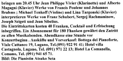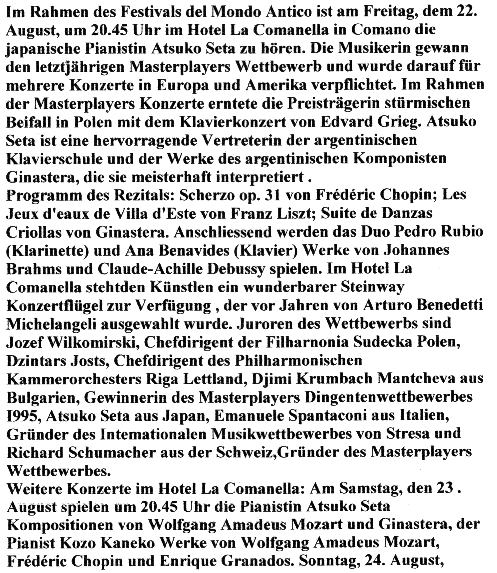 Donnerstag 21./Freitag 22.August 1997 Im Rahmen des Festivals del Mondo Antico Klavierrezital mit Atsuko Seta